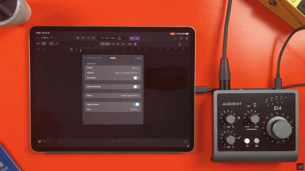 For this walkthrough, I’m using the Audient iD4, but the same steps apply to pretty much any class-compliant USB audio interface. Just be aware that FireWire interfaces won’t work with iPads, even if you try using an adapter.