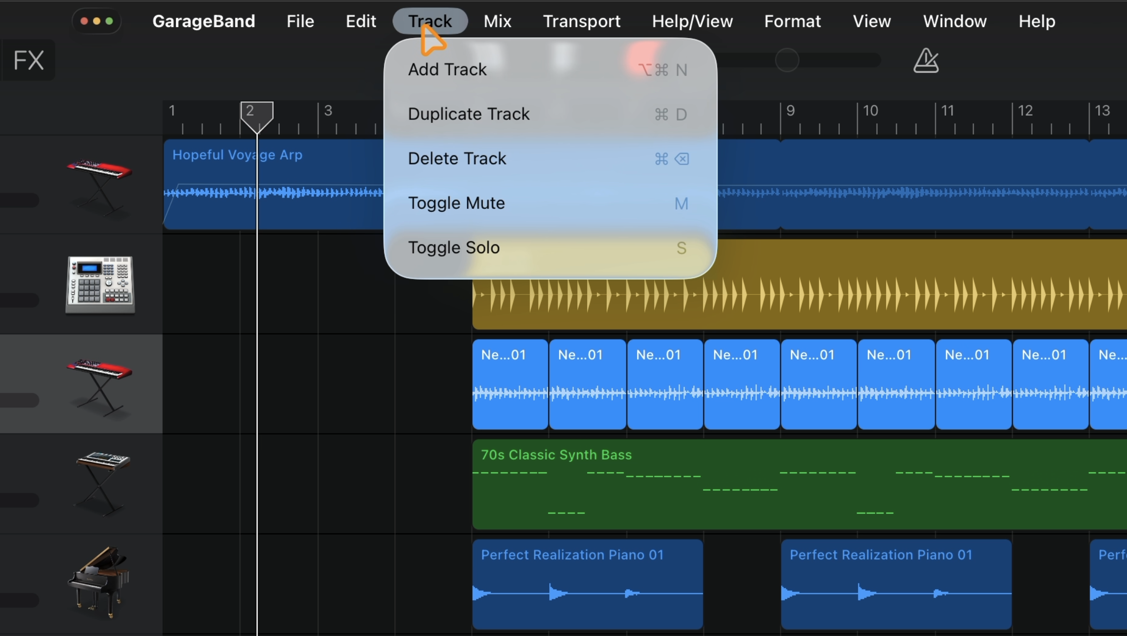 GarageBand now features its own menu options here, giving you quick access to: